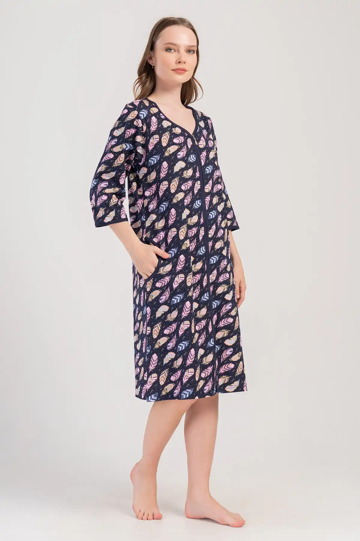 Kadın Büyük Beden Süprem Lacivert Desenli Yarım Kol Fermuarlı Gecelik Tunik