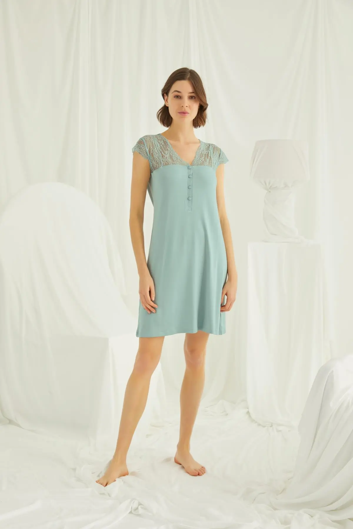 Kolu Omzu ve Yakası Dantelli Önü Düğmeli Açık Yeşil Gecelik