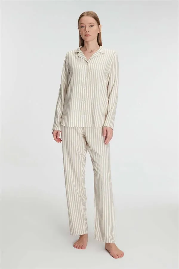 | Ürün Adı | Bej Çizgili Düğmeli Gömlek Yaka Uzun Kollu Kadın Pijama Takımı |