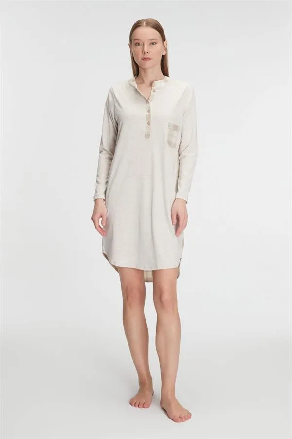 | Ürün Adı | Bej Pamuklu Uzun Kollu Ekose Detaylı Kadın Gecelik |