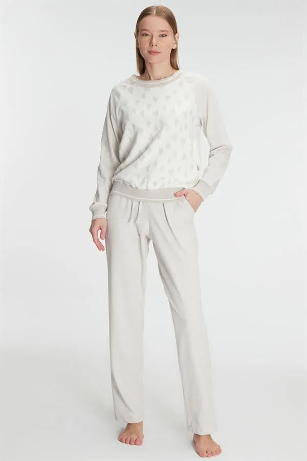 Krem tonların sakinliği ve kalp deseninin zarafetiyle öne çıkan takım, yumuşak örme kadife dokusuyla gün boyu sıcak ve konforlu bir kullanım sağlar. Bisiklet yaka uzun kollu üst giy-çek pratikliği sunarken, esnek kordonlu bel ve bol paça alt rahat hareket imkânı verir. Nefes alan yapısı ve pürüzsüz yüzeyiyle evde keyifli dinlenme anlarına eşlik eder.
