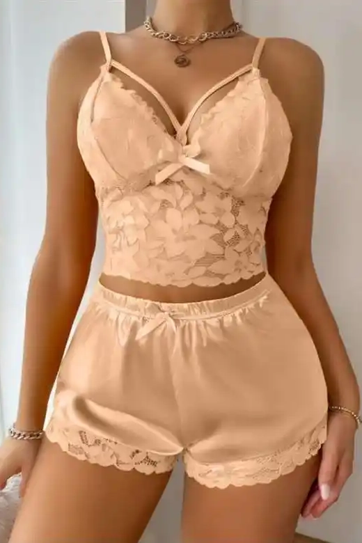 İpeksi sarı satenin parlak görünümü, dantelli büstiyerin feminen çizgisiyle buluşur. Üçgen kup ve ayarlanabilir ince askılar vücuda nazikçe uyumlanırken, mini şortun esnek beli gün boyu rahatlık sağlar. Paçadaki dantel bordür, setin şıklığını öne çıkarır ve modern bir “Fantezi” silüet yaratır. Evde konforlu anlardan özel kutlamalara kadar çok yönlü bir kullanım sunar.