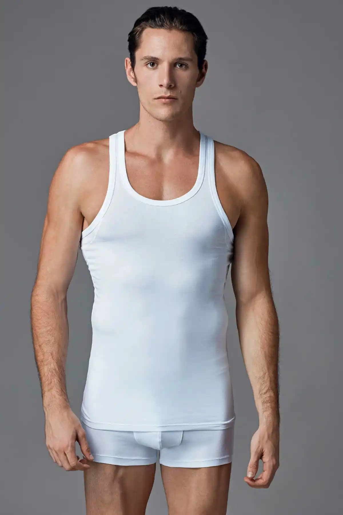 Compact beyaz sporcu atlet, erkek iç giyiminde hem pratik hem de şık çözüm arayanlar için tasarlanmış modern bir parçadır. Bisiklet yaka ve askılı formu, atletin omuz çizgisine uyum sağlayarak gövdeyi sarar ve vücut hatlarını daha fit gösterir. Düz beyaz rengi, özellikle gömlek ve polo tişört gibi parçaların altında pürüzsüz bir görünüm sunar; kumaşın ince yapısı sayesinde katlanma ve kaba durma problemi yaşatmaz.