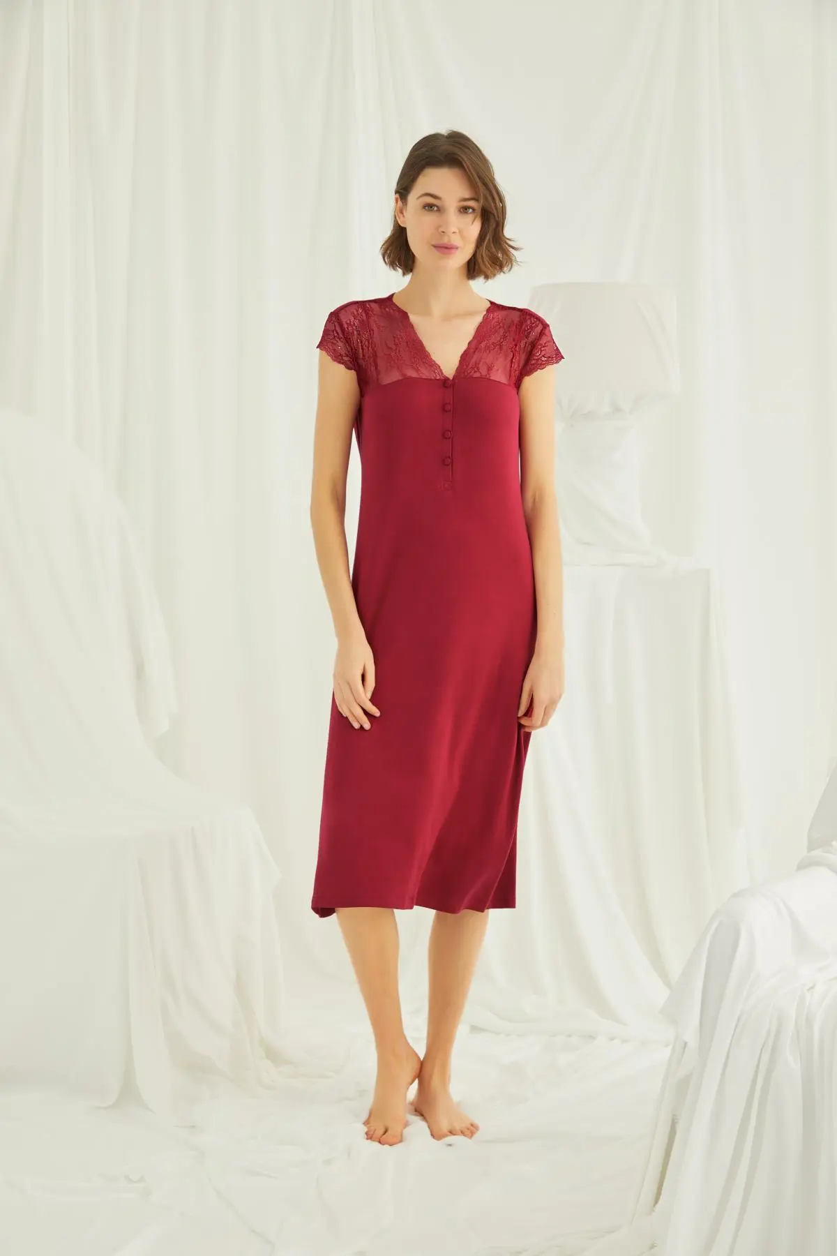 Bordo renkli bu gecelik; V yakası, kol–omuz–yaka çevresinde lez dantel dokusu ve önü düğmeli formuyla feminen bir duruş sunar. Midi boy uzunluk ve akıcı kesim evde şıklığı rahatlıkla buluşturur.