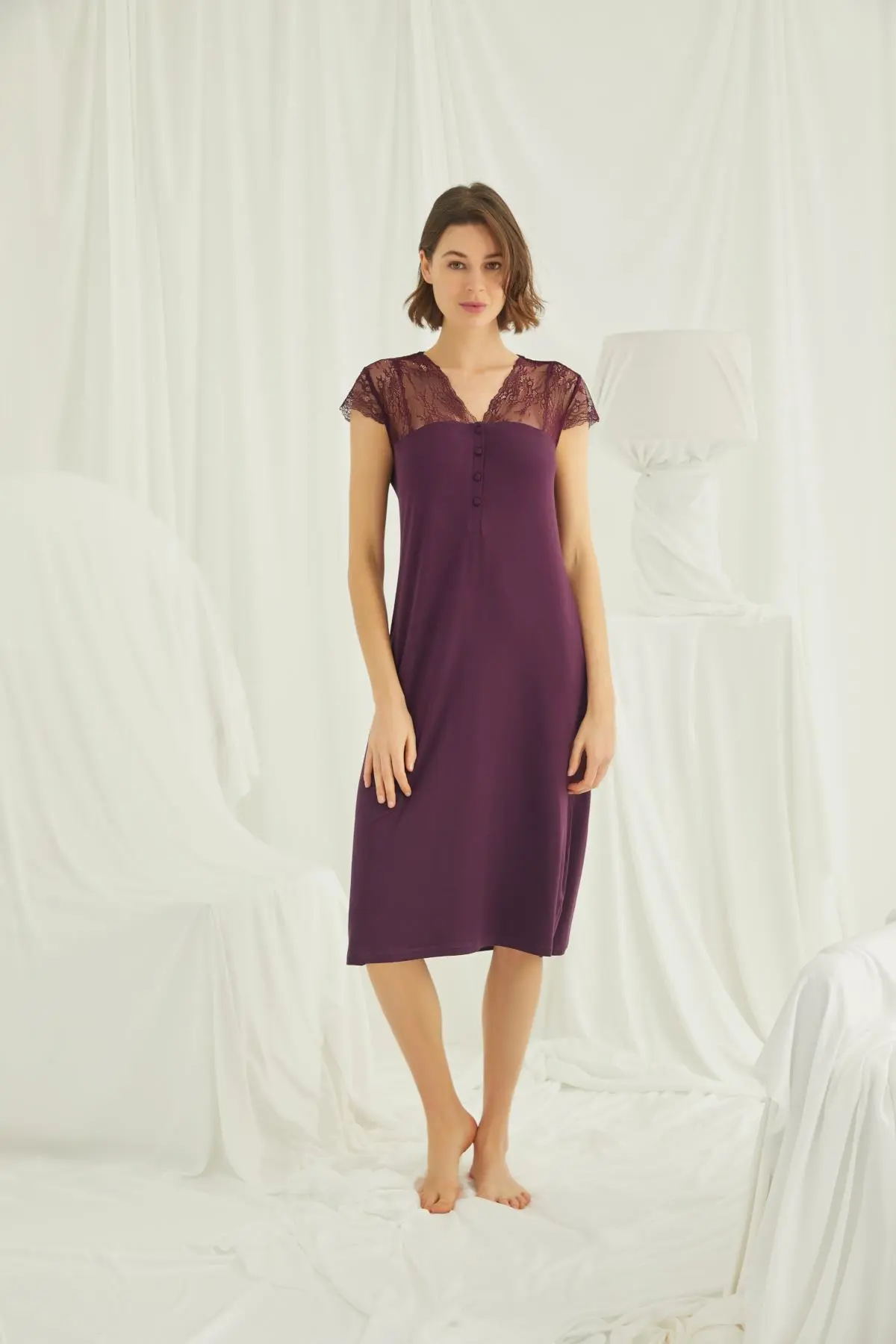 Bordo renkli bu büyük beden gecelik; V yaka, omuz–yaka boyunca zarif lez dantel ve önü düğmeli tasarımıyla feminen bir görünüm sunar. Kısa kollu yapı ve maxi boy akıcı bir siluet sağlar.