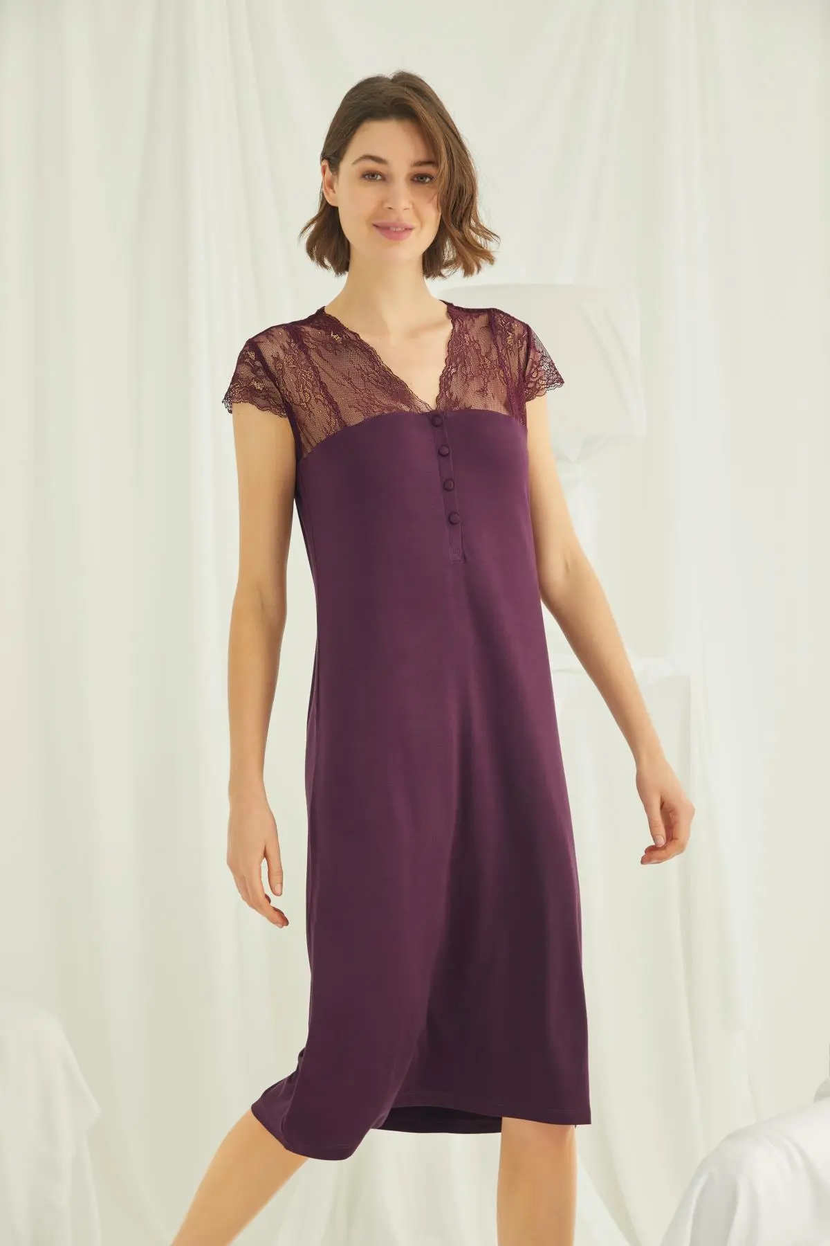 Kolu Omzu ve Yakası Dantelli Önü Düğmeli Mor Gecelik