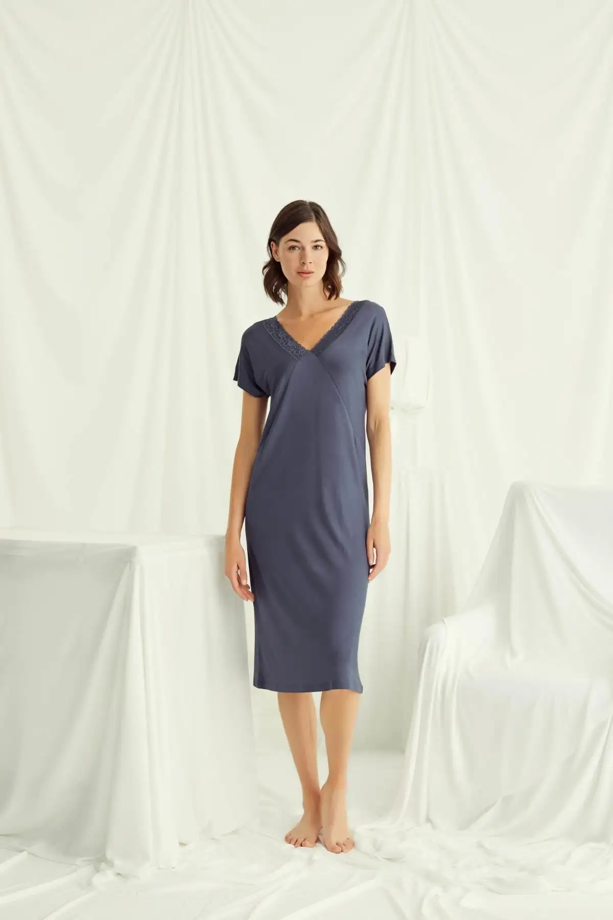 Monamise imzasını taşıyan bu zarif gecelik, dantelli V yaka ve kısa kol tasarımıyla hafif bir şıklık sunar. Akışkan %94 viskoz %6 elastan kumaş gün boyu yumuşak, nefes alabilen bir konfor sağlar. Midi boy kesimiyle estetik ve rahat bir siluet oluşturur.