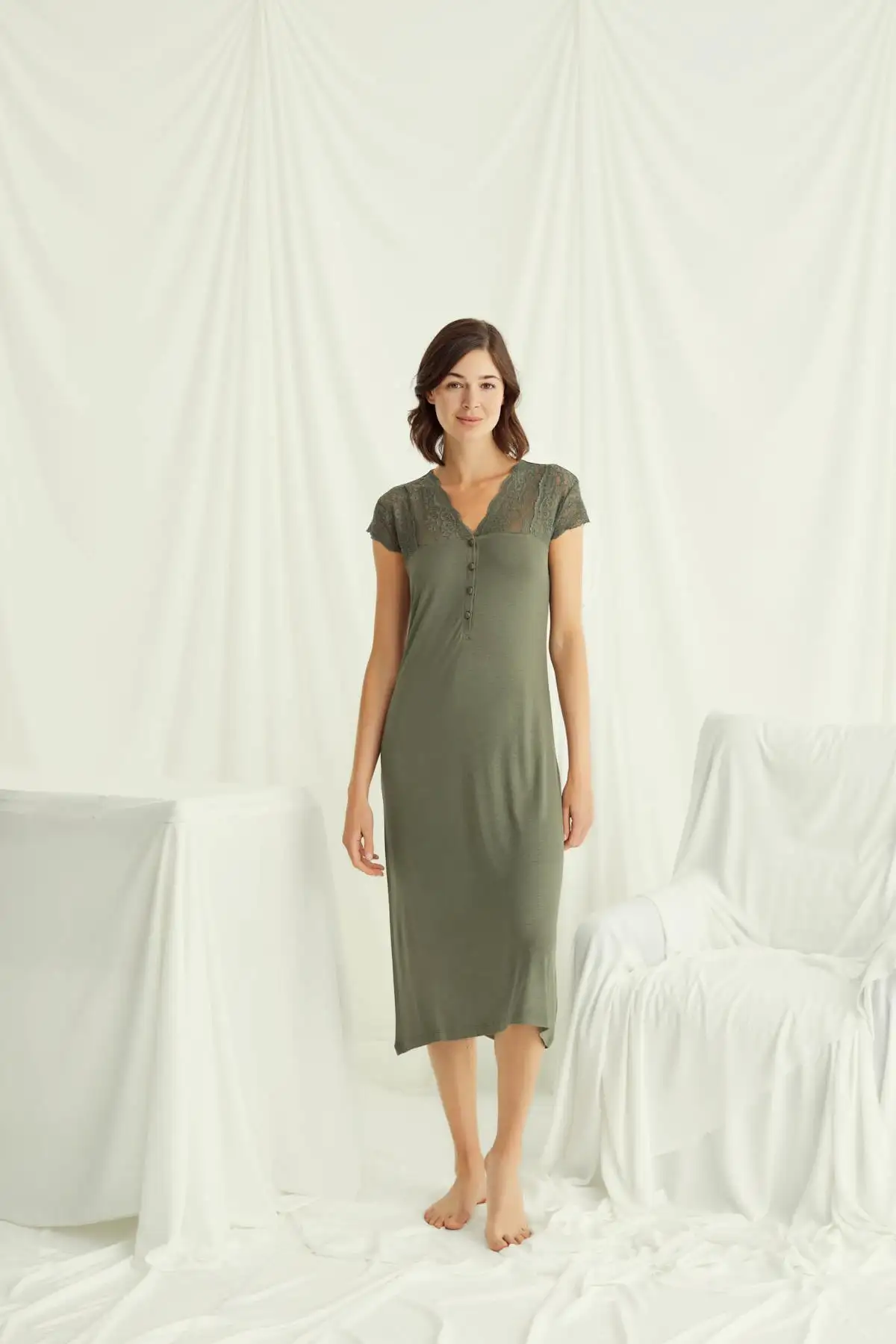 Yakası Kolu ve Omzu Dantelli Önü Düğmeli Haki Gecelik