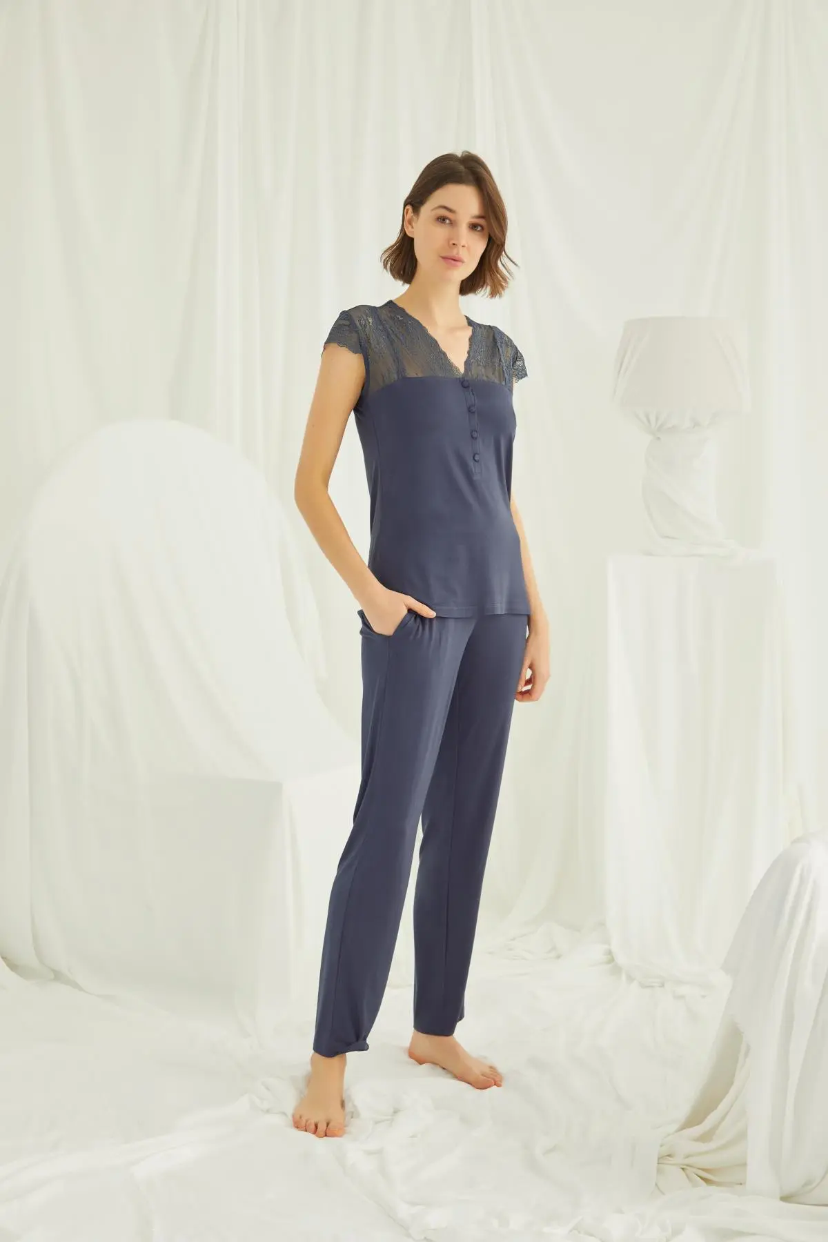 Lacivert renkte, V yakalı ve önü düğmeli bu pijama takımı; yakada, omuz ve kollarda zarif lez dantel ile feminen bir görünüm sunar. Yumuşak örme kumaş ve uzun paça pantolonun cepli tasarımı evde konforu artırır.