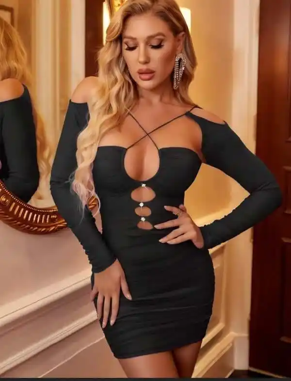 Göğüs kısmındaki ip çapraz detay ve derin dekolte, stile cesur bir dokunuş katar. Esnek penye dokusu vücudu nazikçe sarar; uzun kollar ve mini boy modern bir siluet oluşturur. Kapamasız giy-çek rahatlığı ile gece davetlerinde konfor ve şıklığı bir arada sunar.