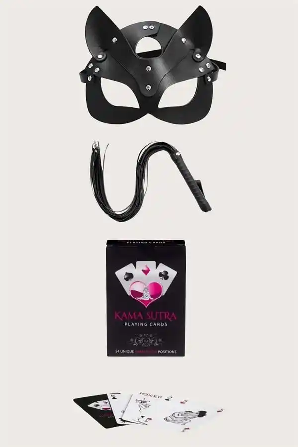 Siyah suni deri kedi maske ve ergonomik saplı kırbaç ikilisini, kutu içi Kama Sutra oyun kartları ile bir araya getiren bu set; şık görünüm, pratik kullanım ve ilham verici fikirleri tek pakette sunar. Ayarlanabilir maskesi farklı baş ölçülerine uyarken, dayanıklı malzemeler uzun ömür hedefi taşır. Şık/gece konseptli özel anlar için kompakt ve etkili bir seçimdir.