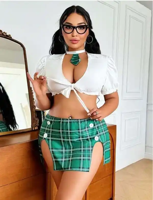 Enerjik yeşil ekose mini etek, yüksek bel ve yırtmaç detaylarıyla cesur bir görünüm sunar. Üst kısım bağlamalı kısa kollu crop tasarıma sahiptir ve dekolteyi şık biçimde vurgular. Seti tamamlayan mini kravat/choker, kombine eğlenceli bir roleplay havası katar. Esnek likra karışımı kumaş vücudu nazikçe sarar.