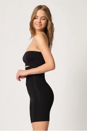 Saten elbisede bile çizgi yapmadı. Kaymaz bel kalkanı tüm gece sabit tuttu.
