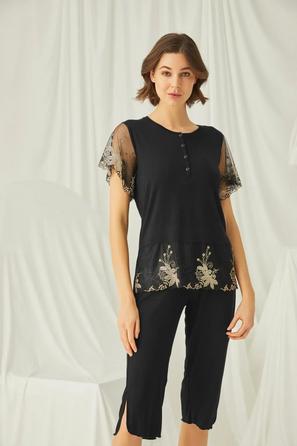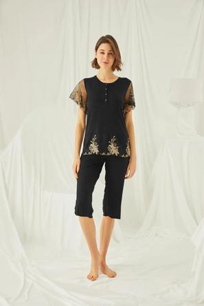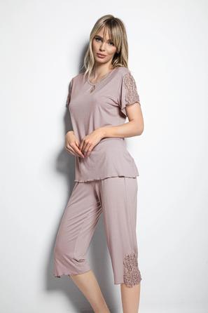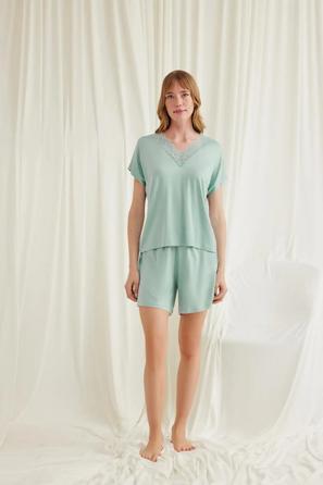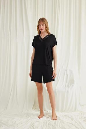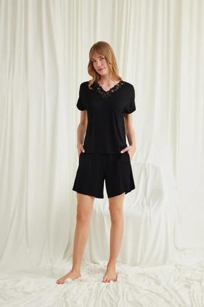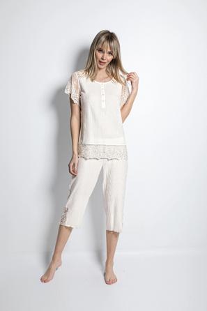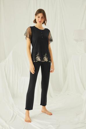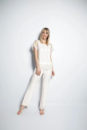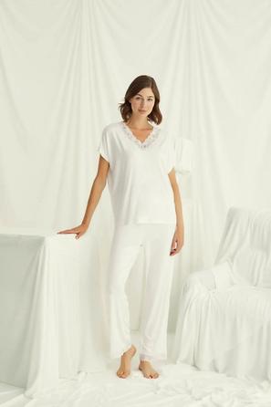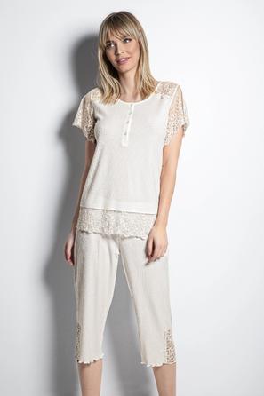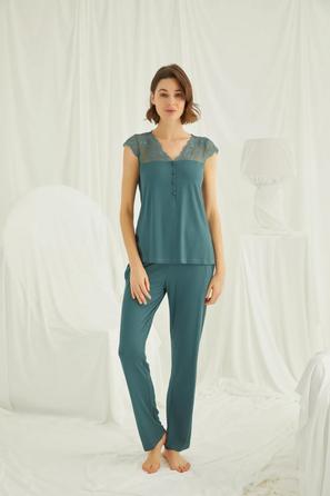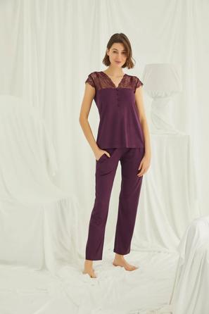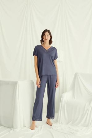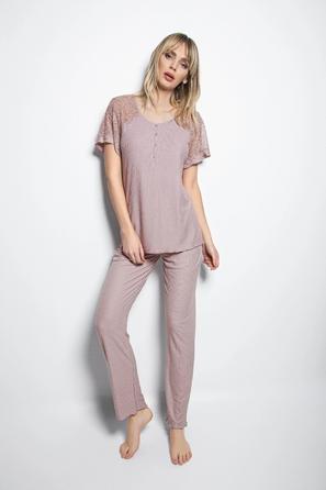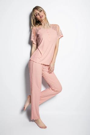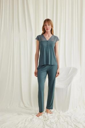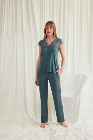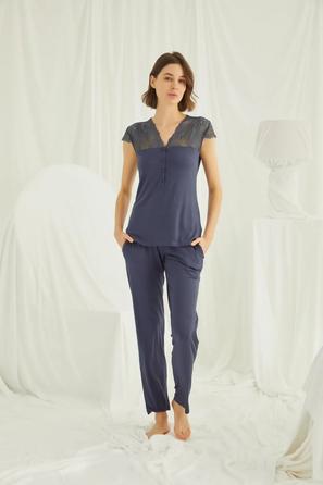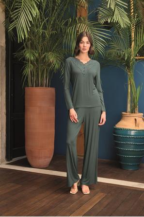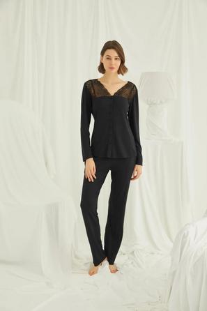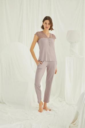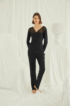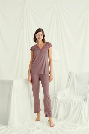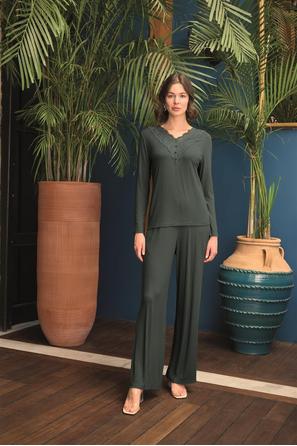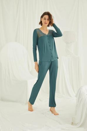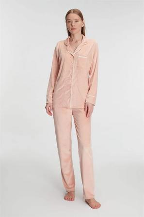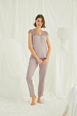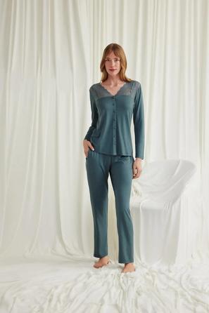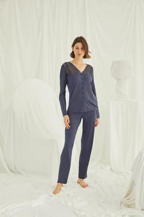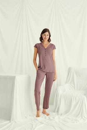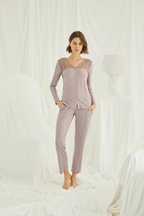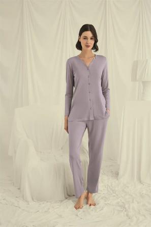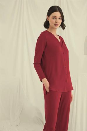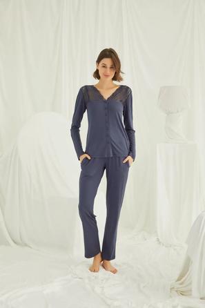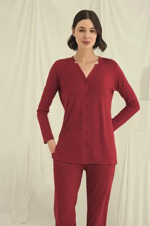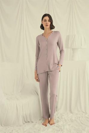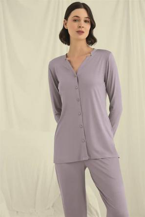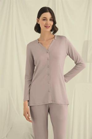 Misafirli akşamlar için düğmeli pijama takımı ile düzenli siluet.