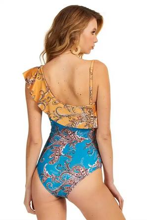 Asimetrik omuz tasarımı çok şık. Pareo ve hasır şapka ile kombinleyince tam bir yaz görünümü oldu.