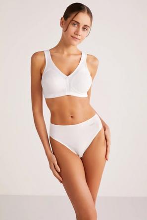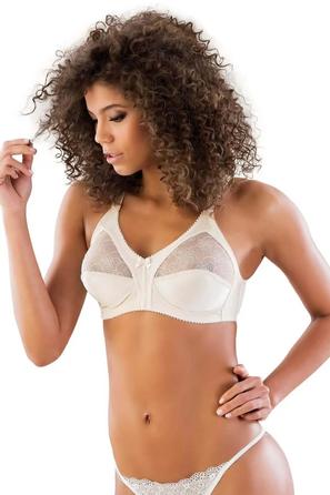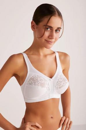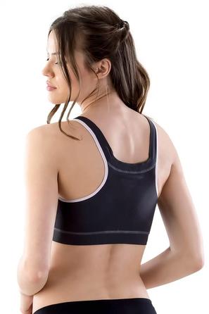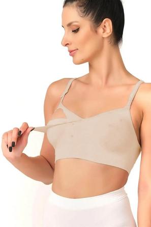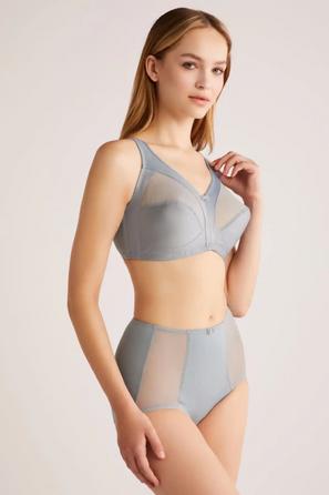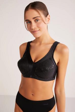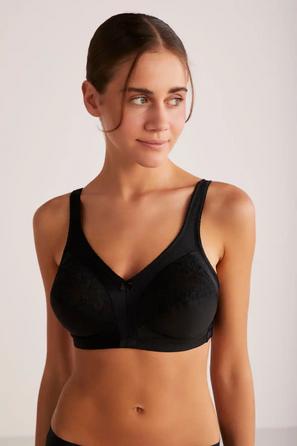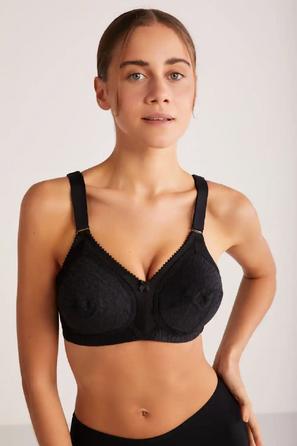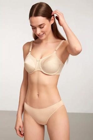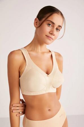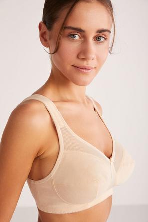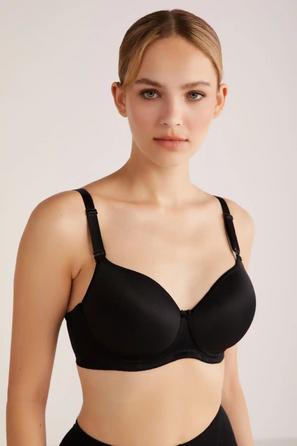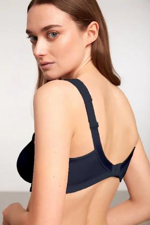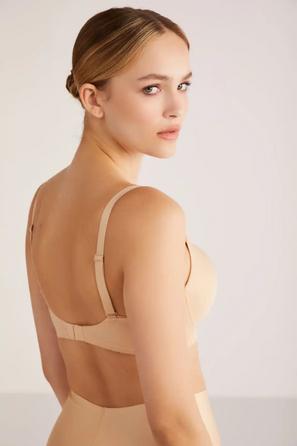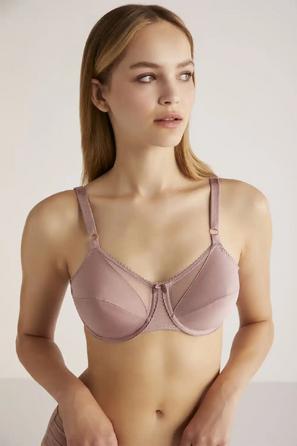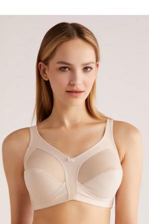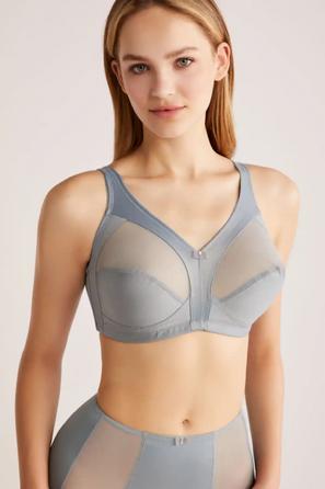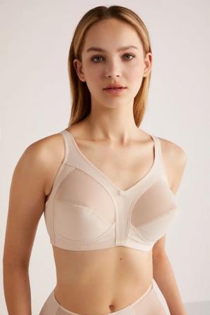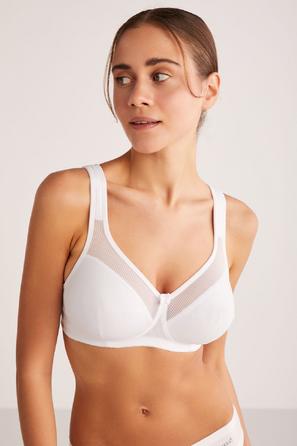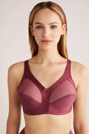 Tel yerine kalıp, çift kat mikrofiber/pamuk astar, geniş yan paneller ve lastik bant yapısı göğsü toplar ve dengeler.