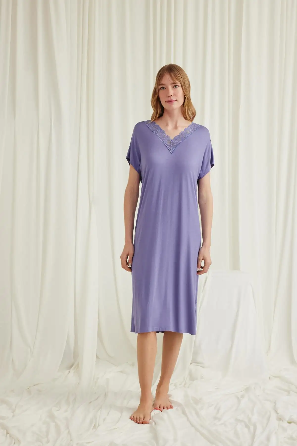 Yakası Dantelli Kısa Kollu Lila Gecelik