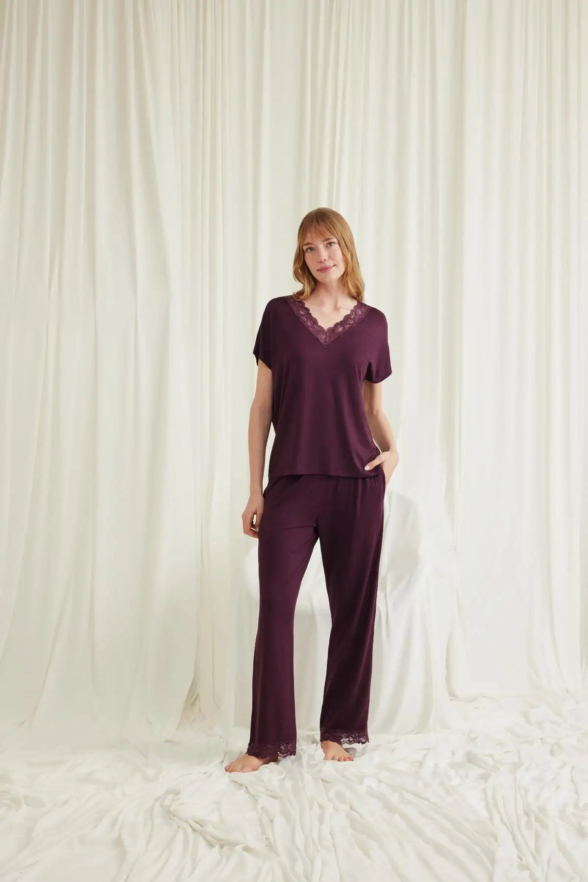 Şık bordo ton, dantelli V yaka ve kısa kol ile buluşuyor. Uzun paça cepli alt ve rahat üstten oluşan takım; yumuşak %94 viskon %6 elastan örme ring kalite kumaşıyla konfor sunar.