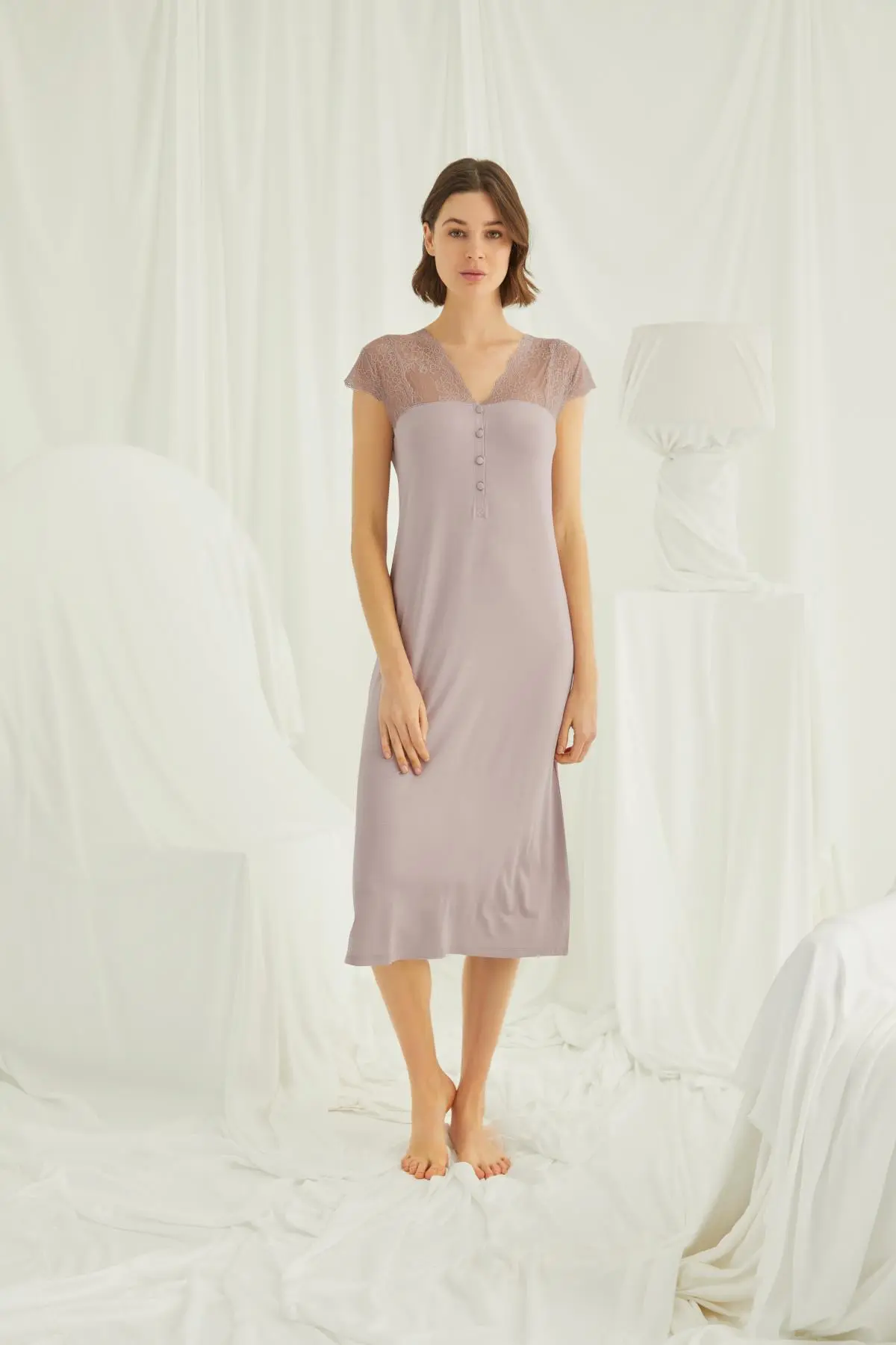 | Ürün Adı | Kolu Omzu ve Yakası Dantelli Önü Düğmeli Vizon Gecelik |