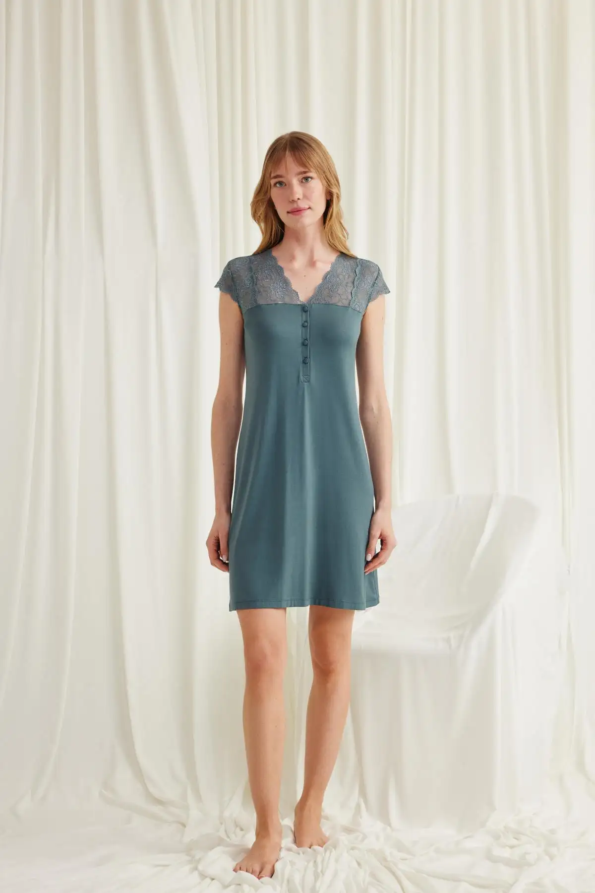 Kolu Omzu ve Yakası Dantelli Önü Düğmeli Yeşil Gecelik