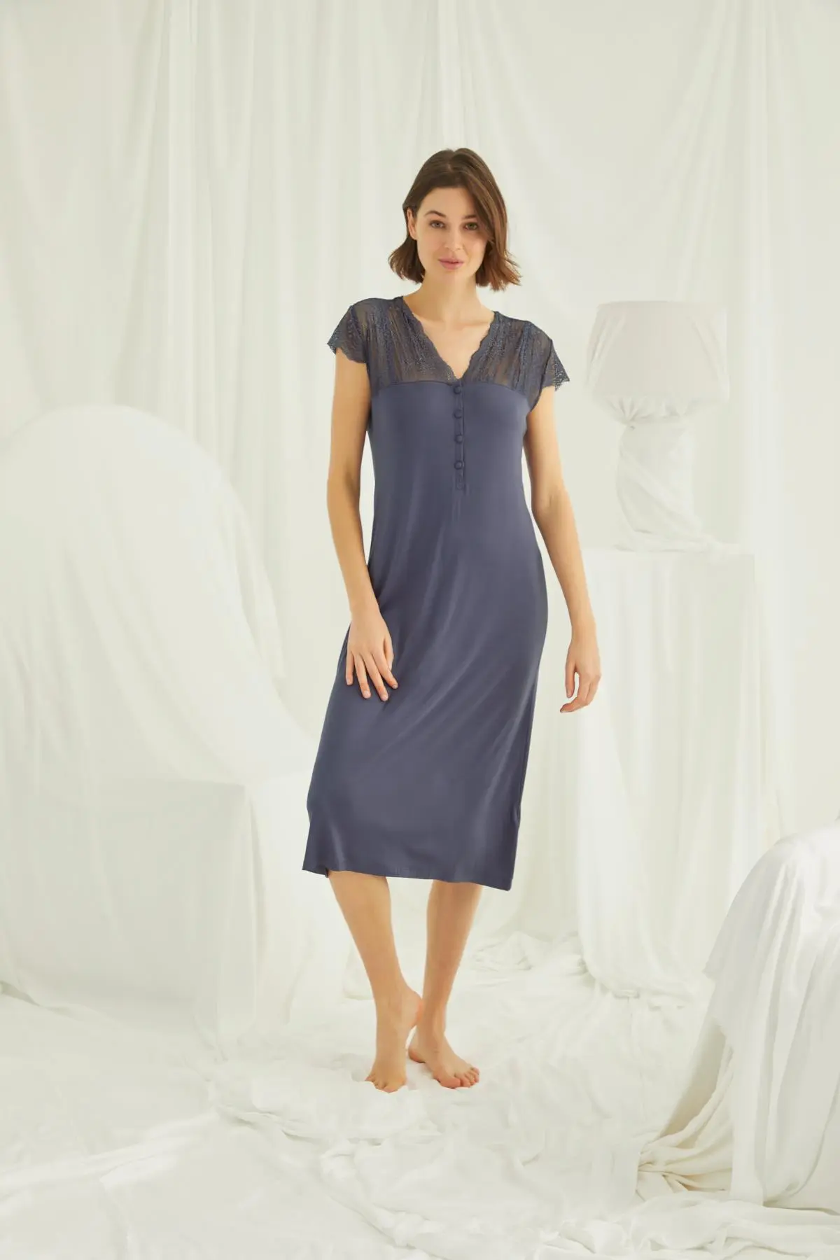 Kolu Omzu ve Yakası Dantelli Önü Düğmeli Lacivert Gecelik
