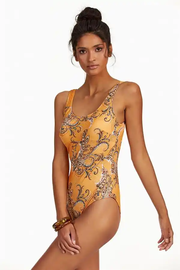 Sıcak turuncu ton üzerine işlenen şal deseniyle öne çıkan bu tek parça mayo, yuvarlak yakası ve zarif sırt dekoltesiyle feminen bir siluet sunar. Esnek, hızlı kuruyan kumaş gün boyu konfor sağlarken çıkarılabilir süngerli cup doğal bir destek verir.