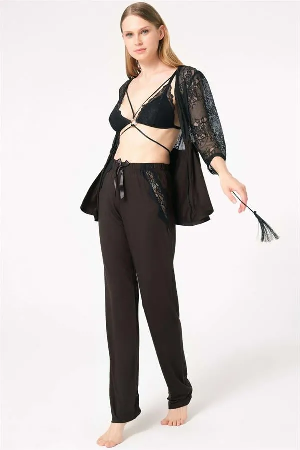 | Ürün Adı | Siyah Viskon Dantel Detaylı 3’lü Sabahlık, Sütyen ve Pantolon Pijama Takımı |