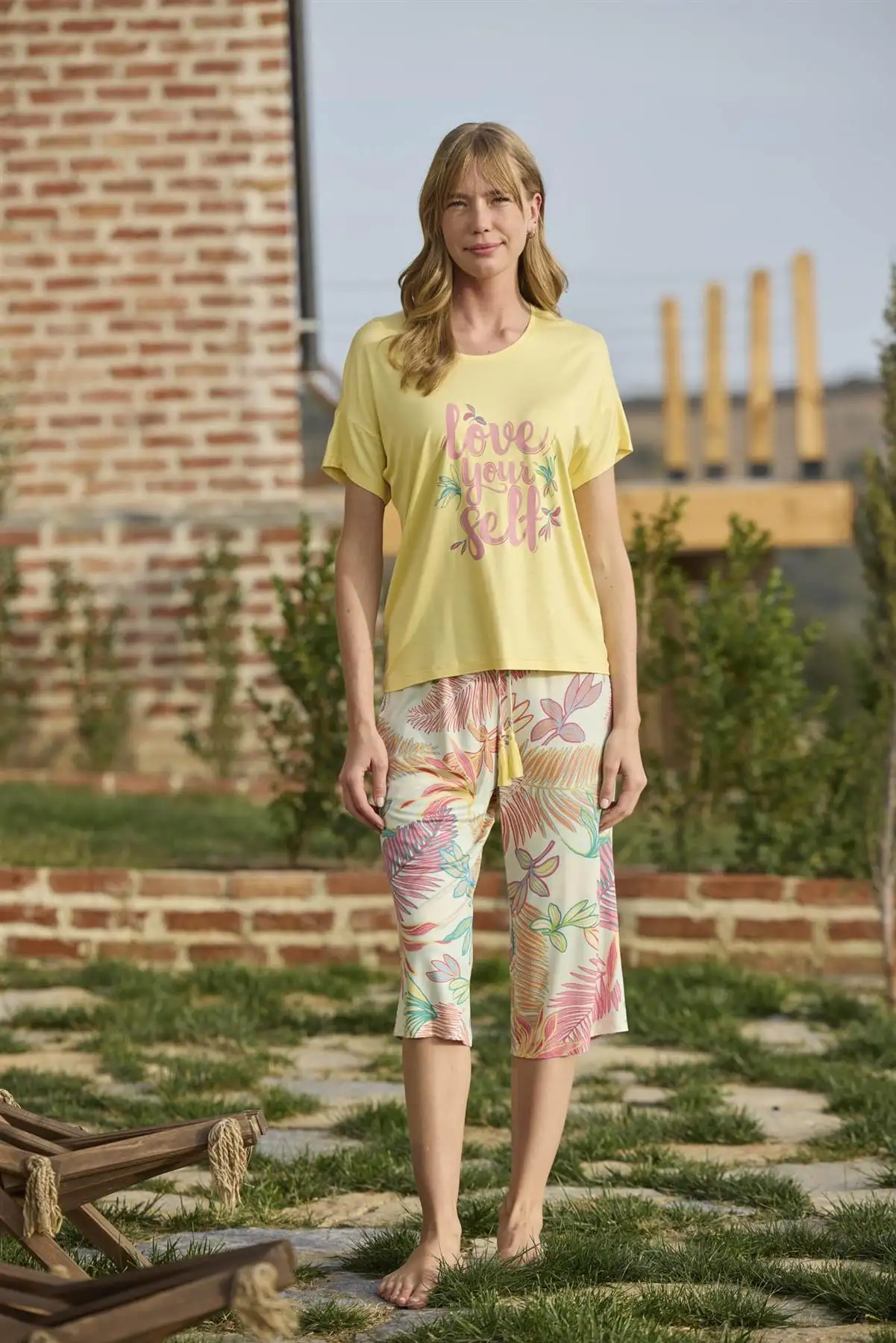 Love Your Self mesajlı sarı üst ve yaprak desenli kapri alt ile yaz enerjisini ev konforuna taşıyan bu 2’li takım, yumuşak süprem örme dokusuyla gün boyu ferahlık sunar. Kısa kol & bisiklet yaka üst, regular kalıp kapri ile özgürce hareket etmenizi sağlar.