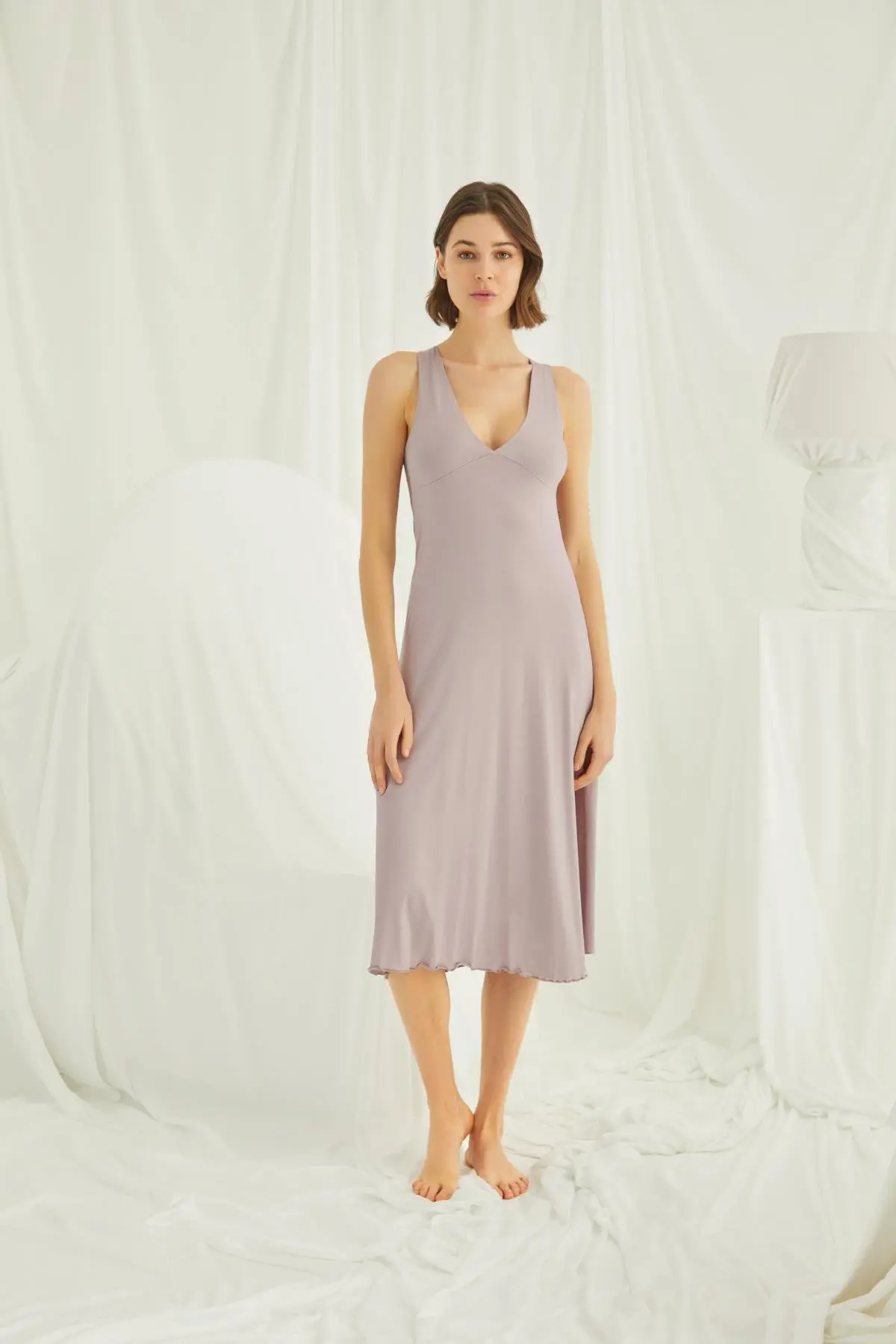 Vizon (taupe) renkte, derin V yakalı bu askılı gecelik; göğüs ve sırt dekoltesi ile zarif bir görünüm sunar. İnce dantel dokunuşları ve yan yırtmaç hareket özgürlüğü sağlarken; akışkan örme kumaşı midi boy kesimle birleşerek şık bir siluet oluşturur.